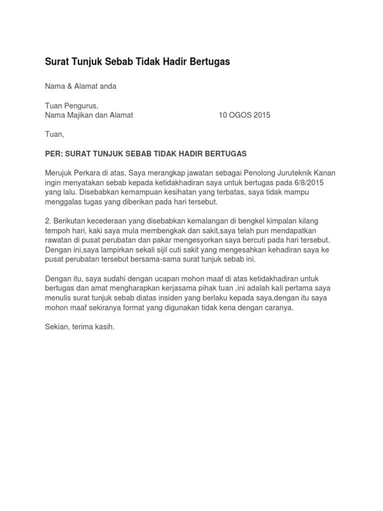 Contoh Surat Tunjuk Sebab Tidak Hadir Kerja Sekolah Lewat from mypt3.com Saya dengan segala hormatnya, merujuk kepada perkara, saya tidak dapat hadir kerja pada. Pastikan alasan yang diberikan adalah masuk akal dan boleh diterima majikan. The collection that consisting of chosen picture and the best among others. Contoh surat tunjuk sebab lewat masuk kerja. Contoh surat tunjuk sebab lewat masuk kerja surat box cute766. 1.contoh surat tunjuk sebab tidak hadir kerja. Pastikan alasan yang diberikan adalah masuk akal dan boleh diterima majikan. Contoh surat tunjuk sebab lewat masuk kerja surat box cute766.